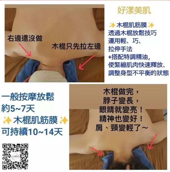 為了提供更全面的舒緩,《好漾美肌》擁有「木棍肌筋膜」深層紓壓服務。木棍肌筋膜推拿深入肌肉層面,透過「木棍肌筋膜鬆動術」進行深層筋膜與肌肉放鬆,調整緊繃不適及不平衡狀態,紓解長期肌肉痠痛,同時美化身體線條。而美式等級手法則能夠針對運動傷害進行專業調理,在舒適的療程中體驗最放鬆的時刻。