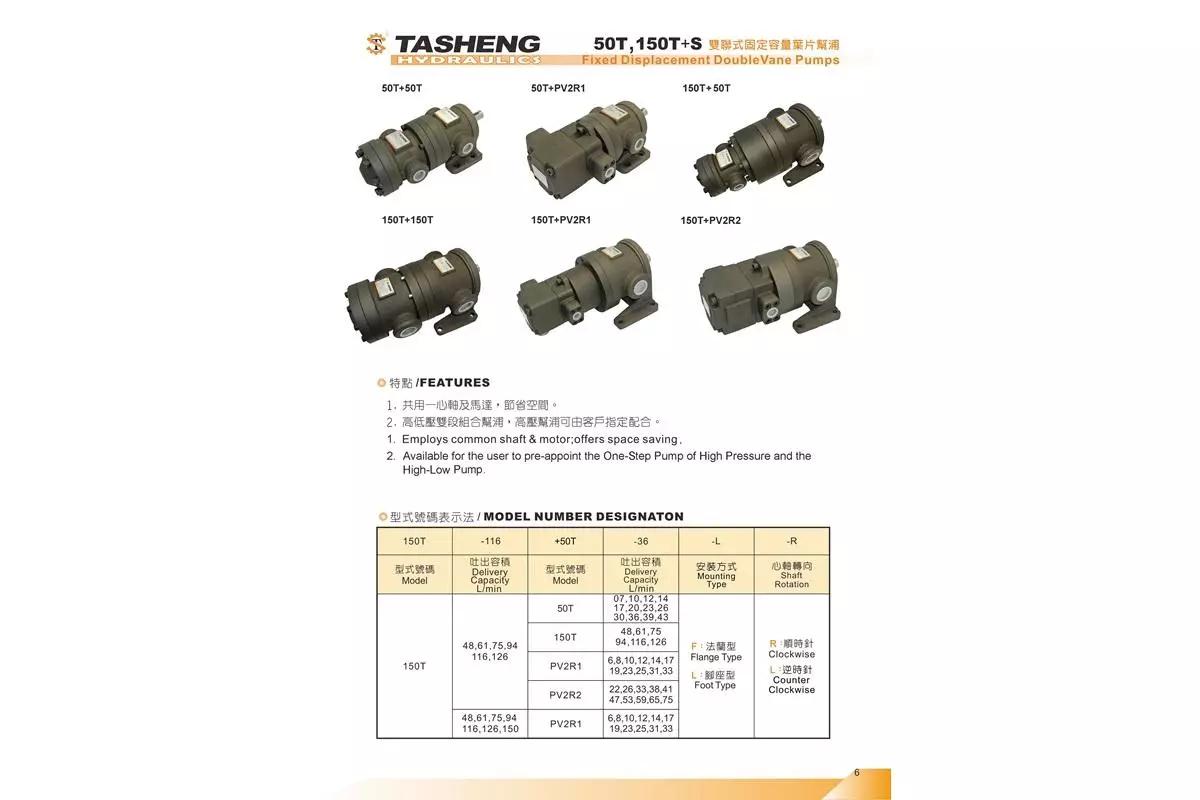 . 50T 固定容量葉片幫浦 —— 高穩定性、低噪音、高效率、省馬力,適用於磨床、壓床、塑膠射出機等機械,特別適合於高低壓油路的低壓幫浦需求。