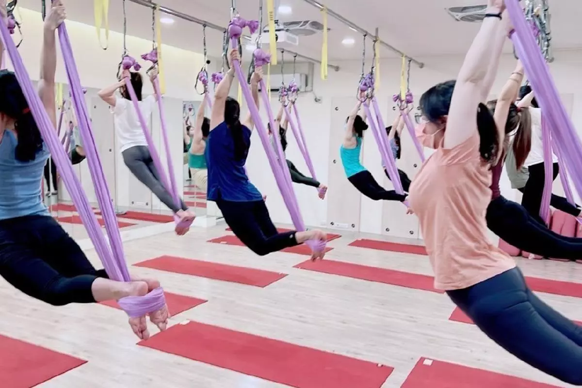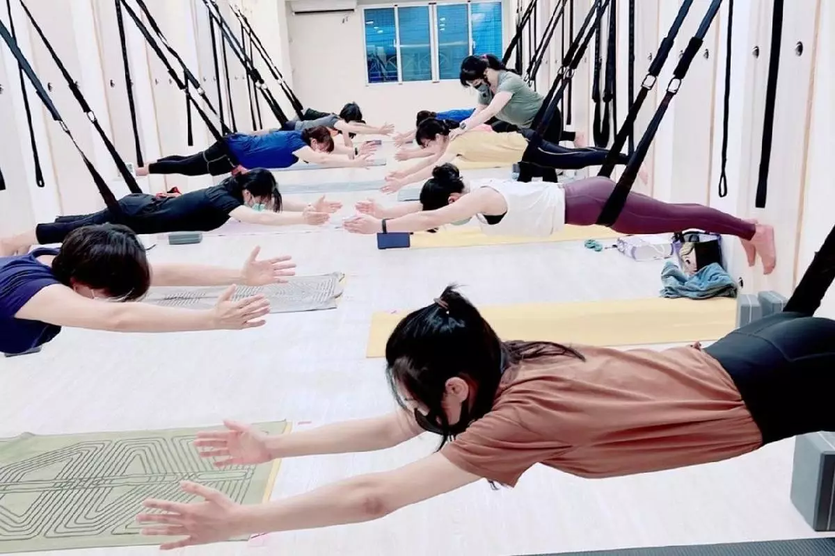 基礎空瑜:利用吊繩進行的空中瑜伽,有助於改善身體的柔軟度和力量。