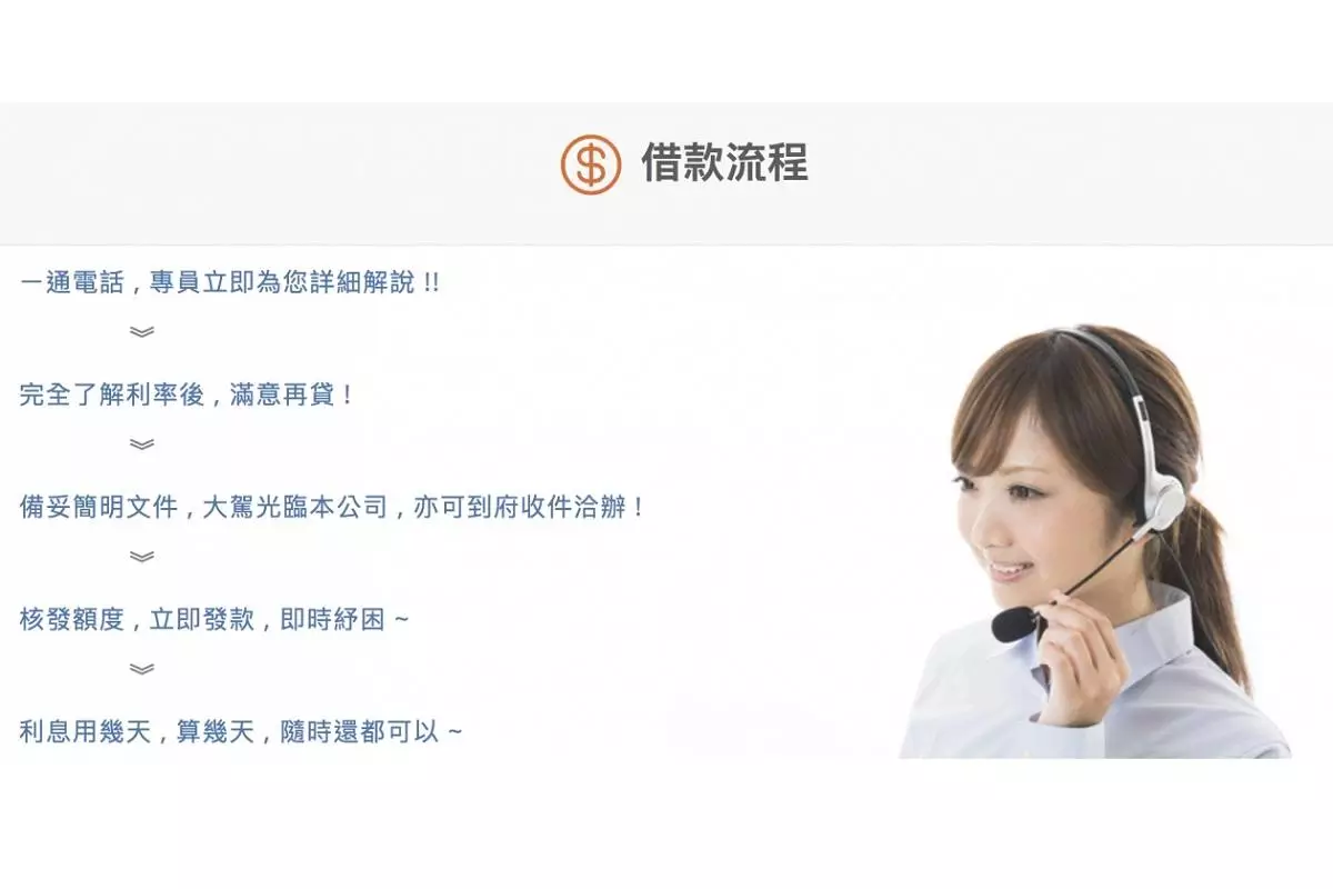 有資金急用又不想向親友週轉時,本公司為您提供一個合法安全又迅速且服務品質高的環境。如果您有資金上的需求,歡迎您親臨本公司或來電洽詢,本公司服務人員將會為您詳細解說。