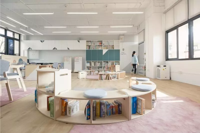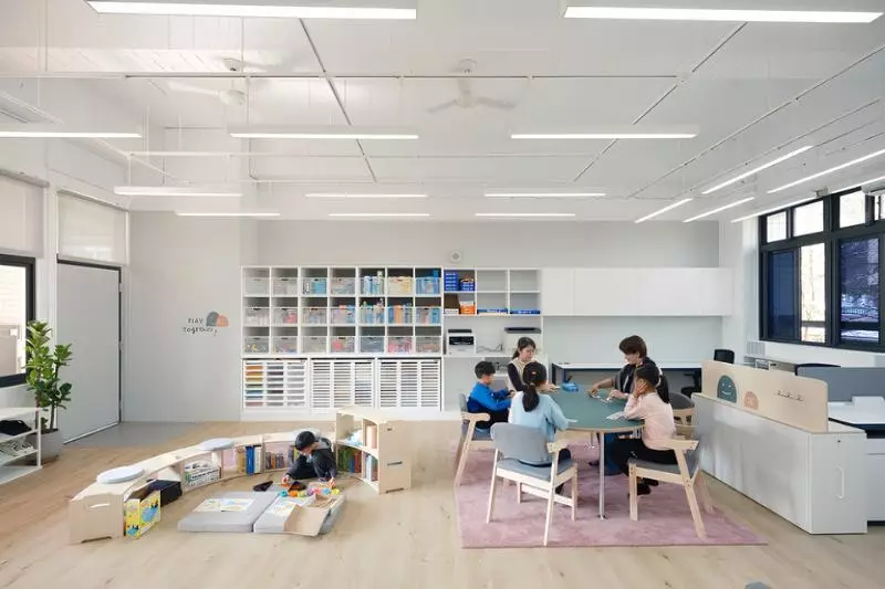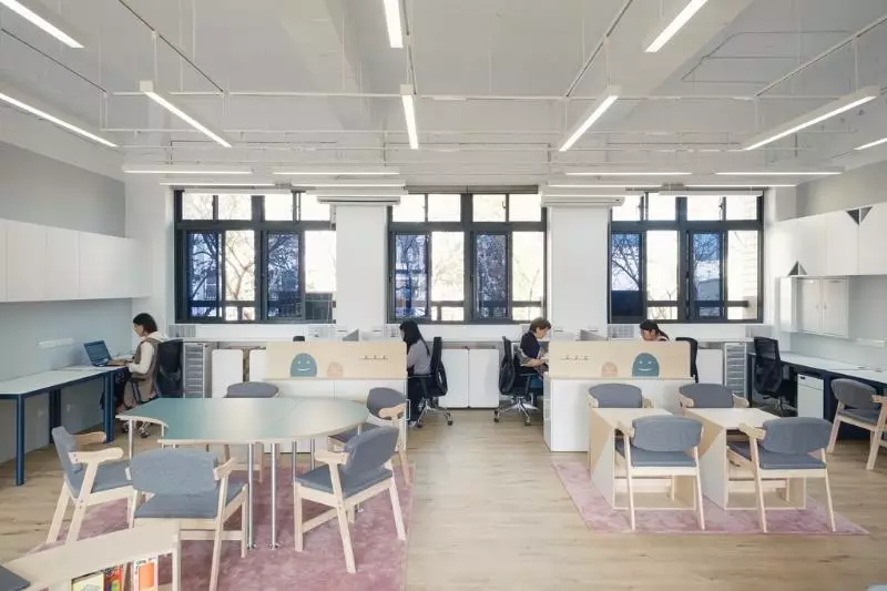 完成後的教室,以低彩卻有層次的色調搭配安靜的光環境,桌面與圓弧細節柔化視覺壓力,讓師生在開闊與包覆之間取得平衡;視線與行走節奏都變得順暢,空間的「呼吸感」被建立起來。
