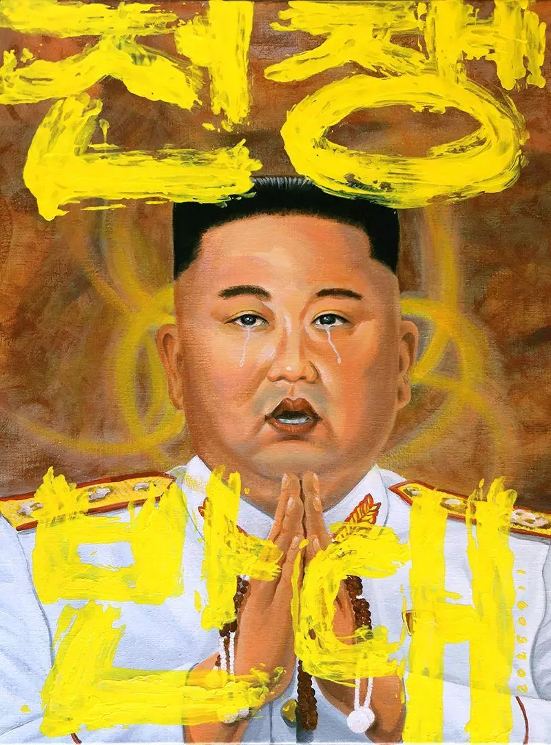 作品的「趣味點」在於藝術家對人物形象的顛覆性處理:三位鐵腕決策者皆被描繪成合十祈禱、眼角含淚的形象,與他們在外展現的強硬姿態形成強烈對比,瞬間瓦解了權力的僵硬外殼。藝術家直言,佛法因果報應儼然,《法華經》教示,惡人亦有佛性,也能藉由唱唸題目而消滅罪障,即身成佛。這三位若能知曉此理,必將感動流淚,放下屠刀。時光林(Time Lin)相信,唯有佛性湧現,才能消減魔性。領導人的眼淚,即代表著人性中最慈悲的佛性被開啟的瞬間。畫面上,多種語言的反戰標語以醒目的書法呈現,表達「放下屠刀,立地成佛」的普世信念。