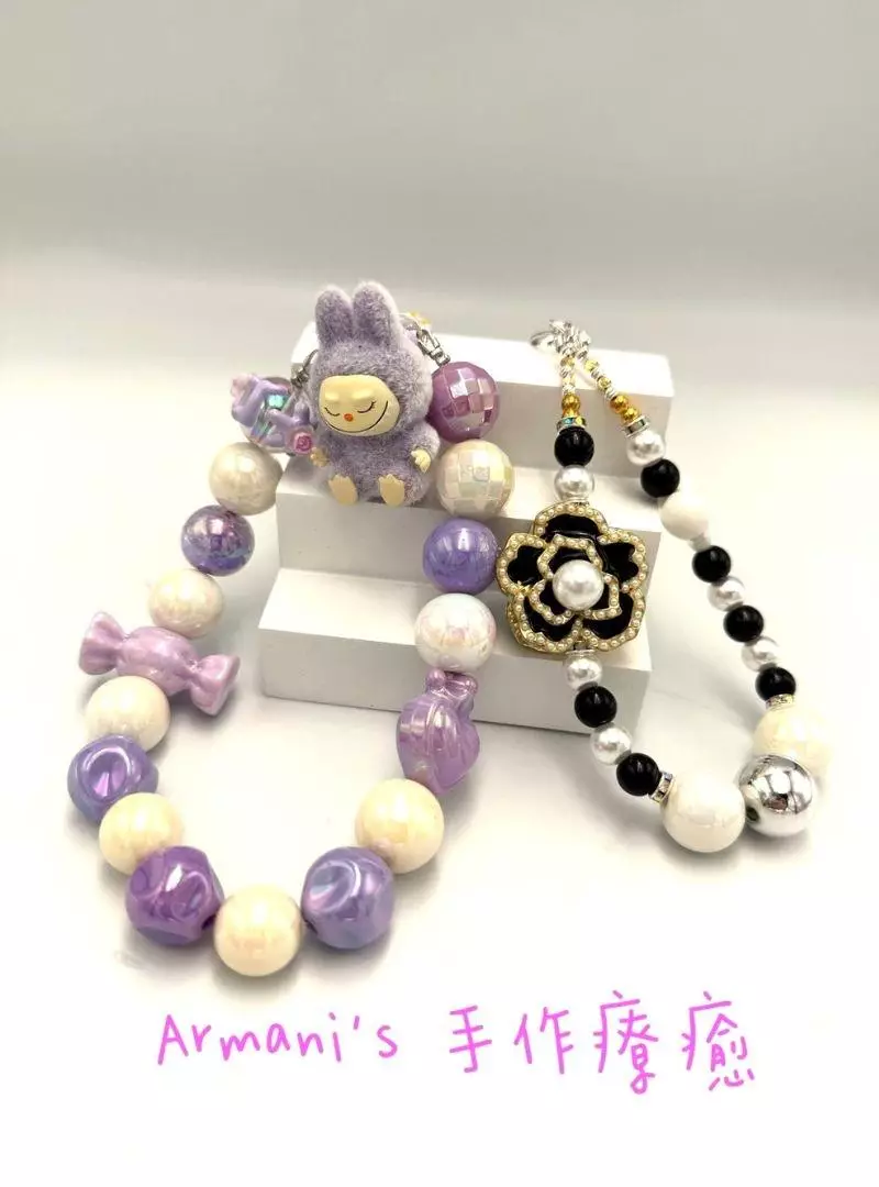 Armani’s手作療癒的作品風格多變,從夢幻的粉紫色調、甜美蝴蝶結,到歐美感小香風設計,都可依照顧客需求客製製作。每款手機鍊、包包鍊不僅能搭配穿搭,更成為日常生活中最溫柔的陪伴。