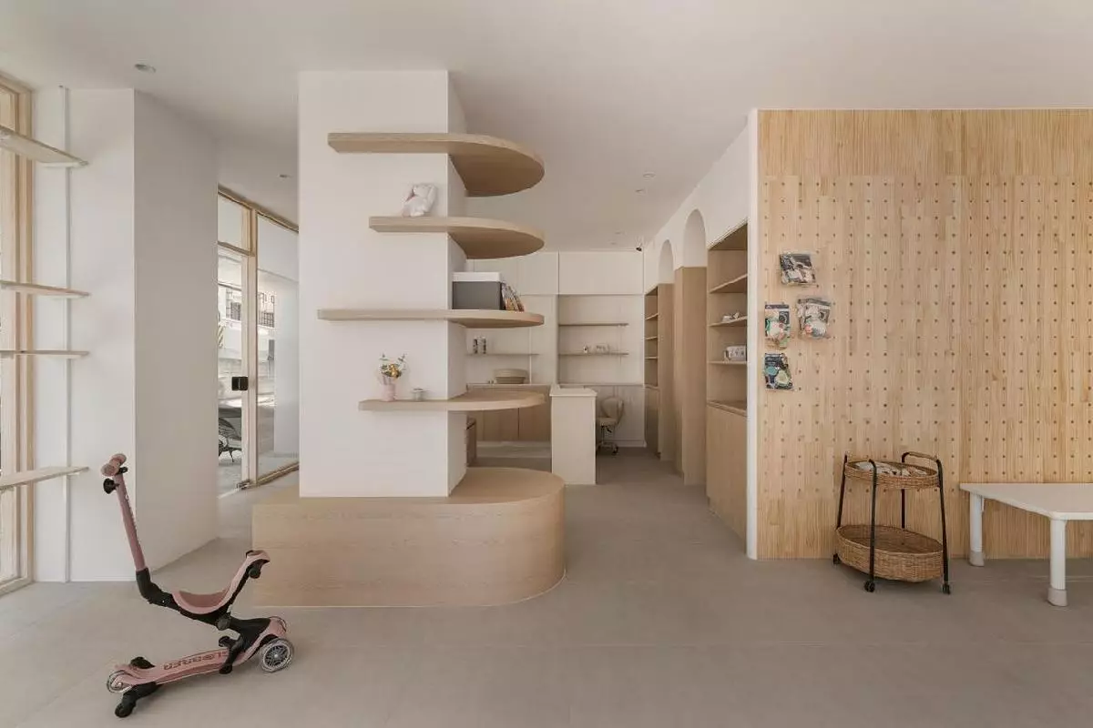 ▲親子選物店裝潢設計推薦|《平室空間設計》以木質元素與弧形層架打造明亮親子空間,創造柔和溫馨的商業場域(圖/Medick Marketing Ltd.提供)