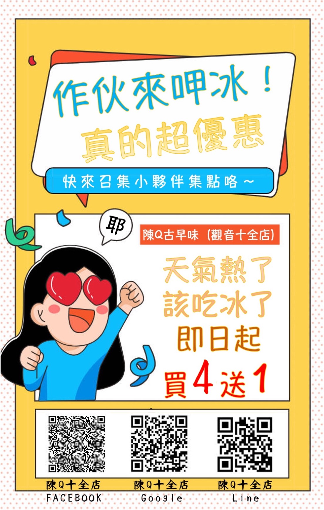 今年夏季已經悄咪咪的挺進我們的生活了,炎熱的午後最好來上一晚冰鎮剉冰來安撫燥熱的五臟六腑~桃園觀音區的民眾有福了!「陳Q古早味黑糖剉冰」十全店,推出全店消費不論內用還是外帶都享有買四送一的超狂優惠!還不快揪伙吃冰吃起來?